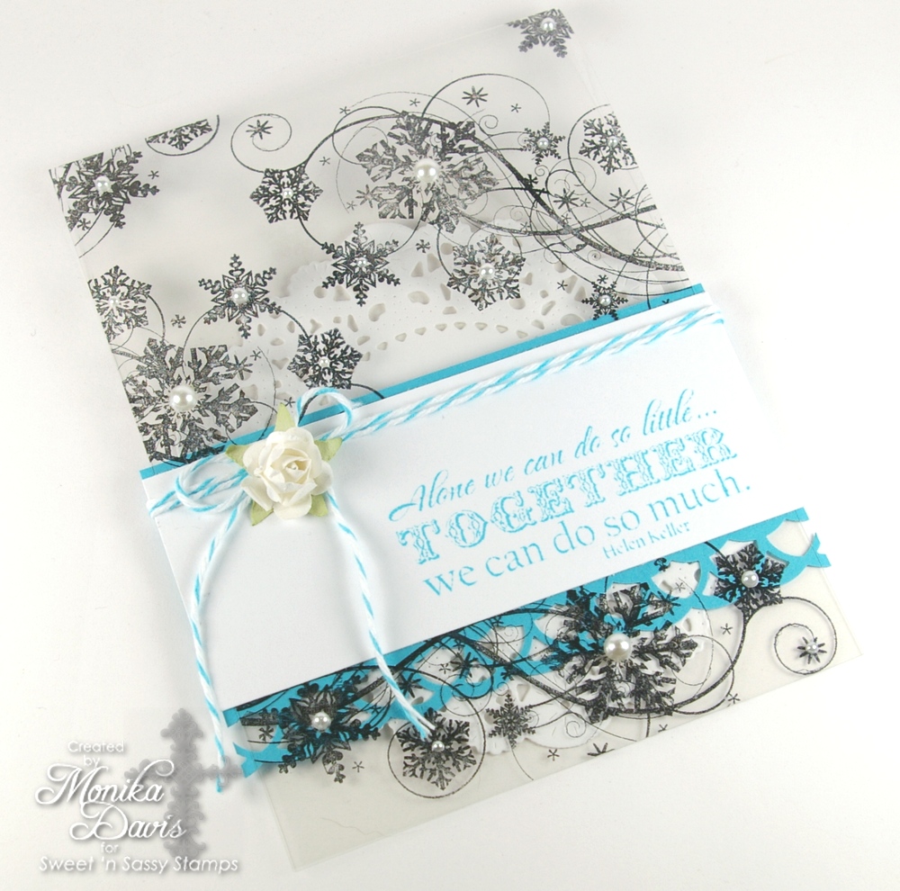 I stamped the flourishes with Black StazOn ink on the clear sheet. The greeting was stamped on a white strip of paper. Then the front was decorated with Pearls, Caribbean Baker's Twine, and a paper flower.