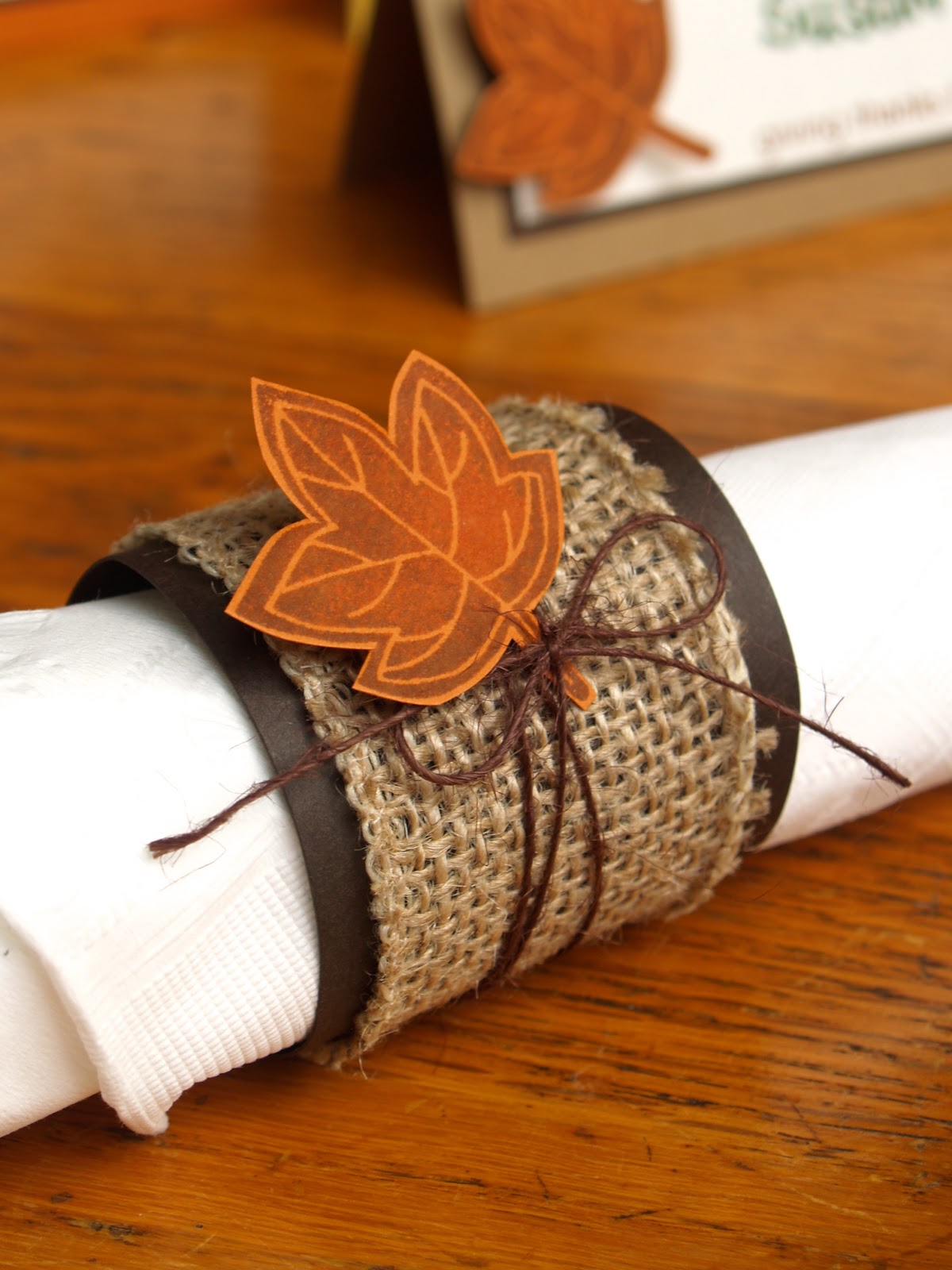 To create a simple napkin ring, trim a strip of cardstock (I usually do mine about 1.5x6 inches.) Roll it gently, and add adhesive. I then wrapped mine with a layer or burlap ribbon, twine, and then tucked my stamped leaves into each one. (I added a dot of foam tape behind each leaf to secure it.)