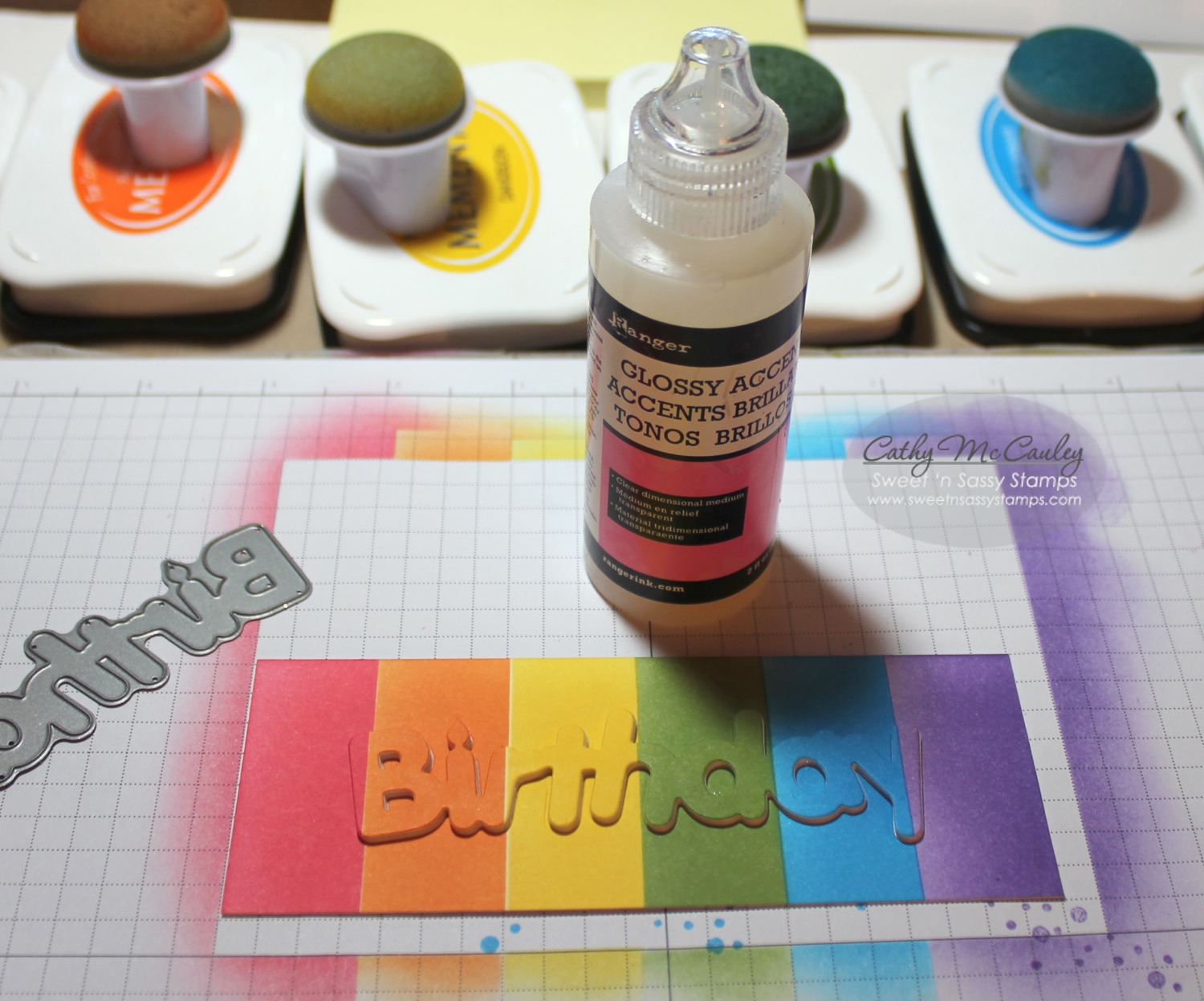 …ending up with the one you cut from your background panel. I use dots of Glossy Accents to glue the layers together because it gives me a little wiggle room to get the dies lined up correctly.