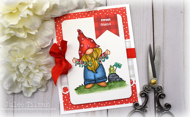 The Miss You Gnome Digi is new in the shop today. I just love this sweet little gnome with his snail friend holding that little sign! So cute! I printed the image, then colored with Copic markers and cut with a rounded rectangle die. A little patterned paper makes up the layout, and I embossed the sweet and friend words from Birthday Wordfetti in white on the little tag. I finished with a seam binding bow.